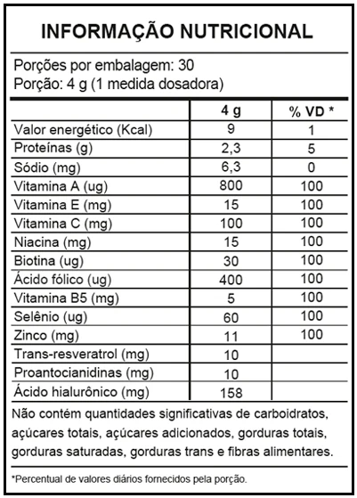 INGREDIENTES: Peptídeos Bioativos de Colágeno Hidrolisado com peso molecular médio de 2kDa, Hialuronato de Sódio (Ácido Hialurônico), Ascorbato de Sódio (Vitamina C), DL Alfa Acetato de tocoferol (Vitamina E), Sulfato de zinco (Zinco), Niacina (Vitamina B3), Extrato de cranberry (Proantocianidias), Trans-resveratrol, Pantotenato de Cálcio (Vitamina B5), Palmitato de retinol (Vitamina A), Ácido Fólico (Vitamina B9), Selenito de Sódio (Selênio), Biotina (Vitamina B7), Emulsificante Polidextrose e Goma xantana, Antiumectante Dióxido de Silício. NÃO CONTÉM GLÚTEN. ZERO LACTOSE. NÃO CONTÉM CORANTES ARTIFICIAIS. Validade de 2 anos. Produto indicado para maiores de 19 anos. ESTE PRODUTO NÃO DEVE SER CONSUMIDO POR GESTANTES, LACTANTES E CRIANÇAS.